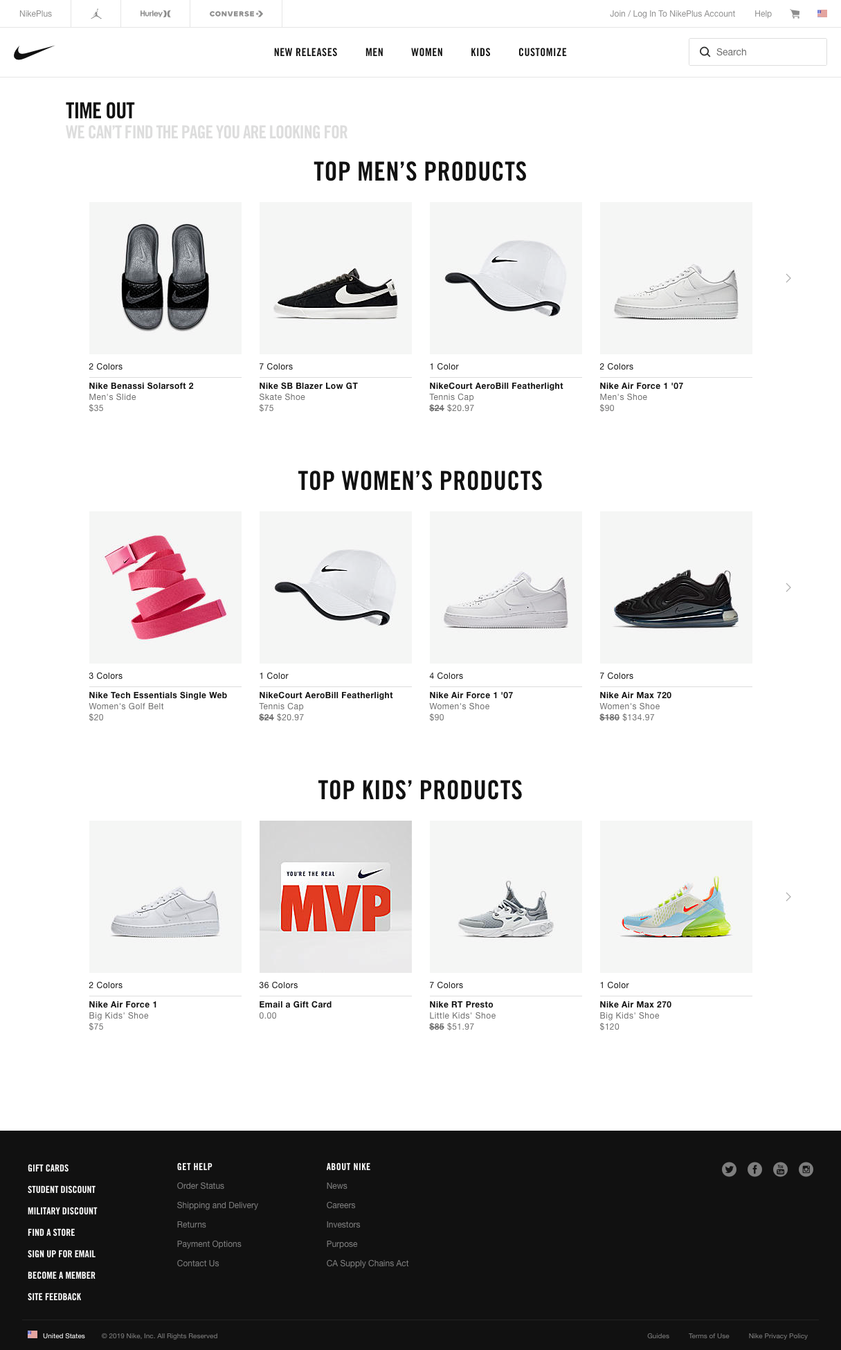This activewear and clothing provider has a catchy 404 “oops” phrase and displays popular products and collections to catch the visitors eye while clicking through their content.
